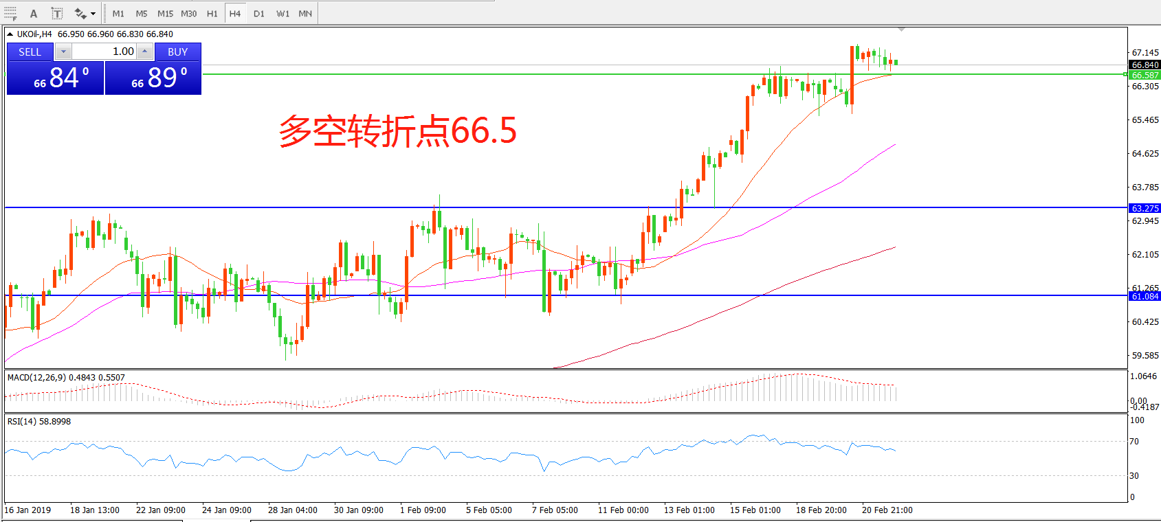 4小时图看,油价呈现冲高回落形态,但下方21均线支撑依然有效,短线思路偏多,MACD红柱走平,重点关注66.5一线支撑。