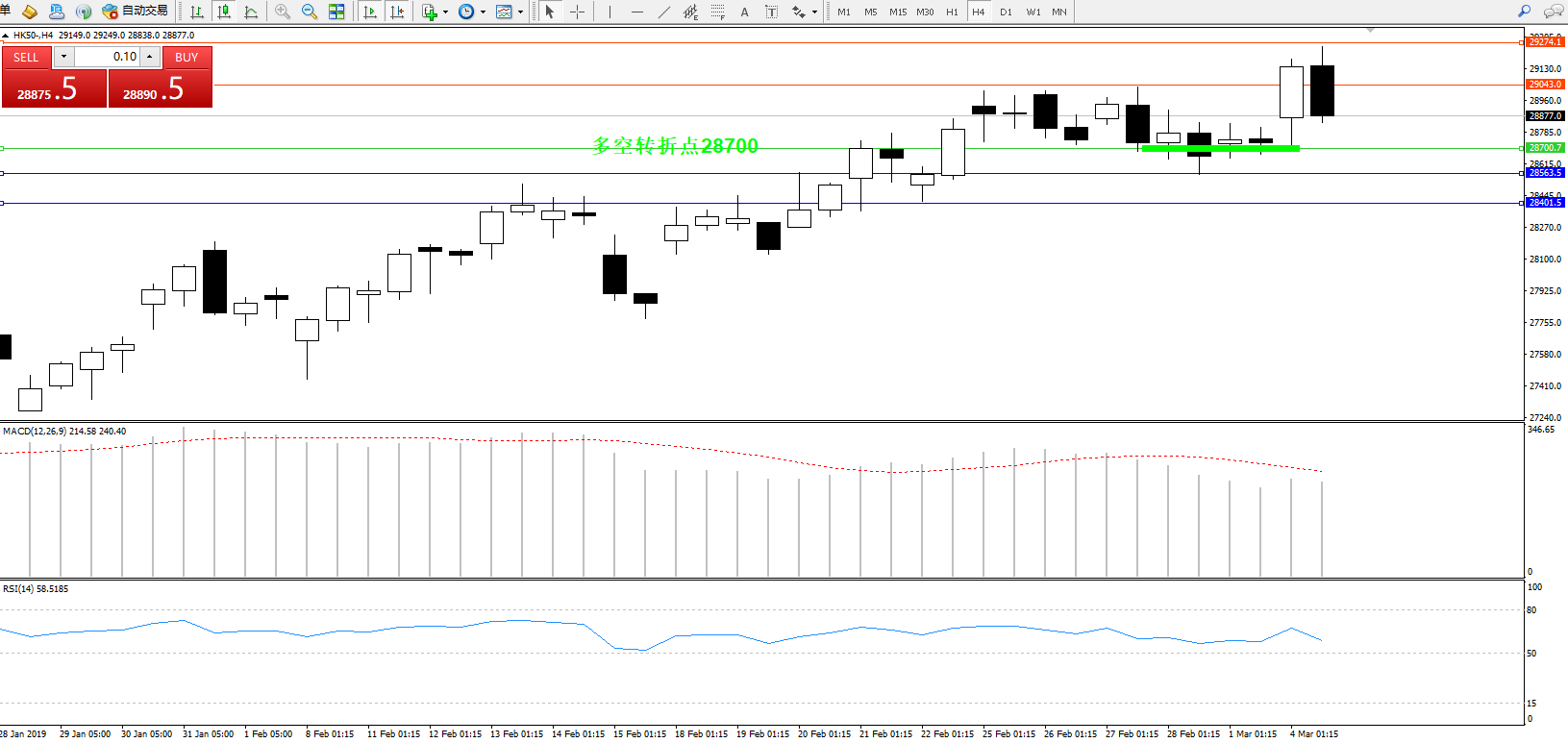 恒指HK50 ——4小时K线图显示: