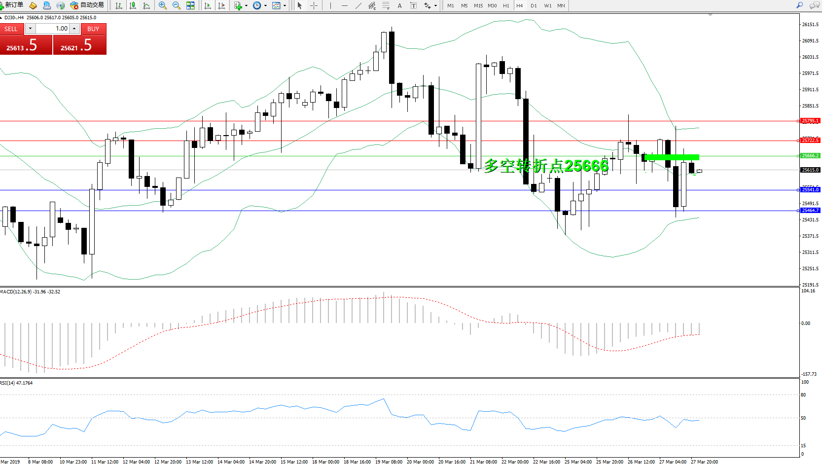 道琼斯指数DJ30—— 4小时K线图显示: