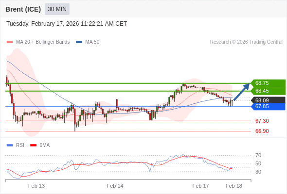 在 67.85 之上,看涨,目标价位为 68.45 ,然后为 68.75 。