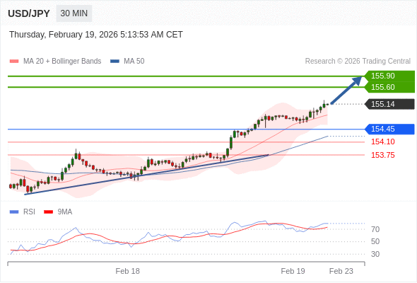 在 154.45 之上,看涨,目标价位为 155.60 ,然后为 155.90 。