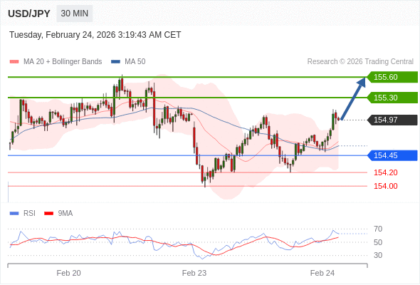 在 154.45 之上,看涨,目标价位为 155.30 ,然后为 155.60 。