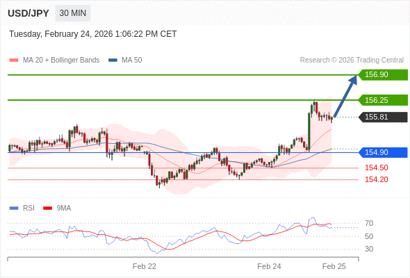 在 154.90 之上,看涨,目标价位为 156.25 ,然后为 156.90 。
