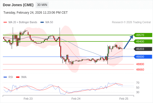 在 49000 之上,看涨,目标价位为 49400 ,然后为 49570 。