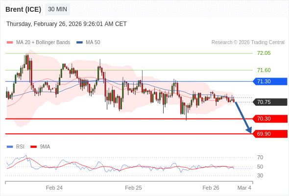 交易策略: 在 71.30 之下,看跌,目标价位为 70.30 ,然后为 69.90 。