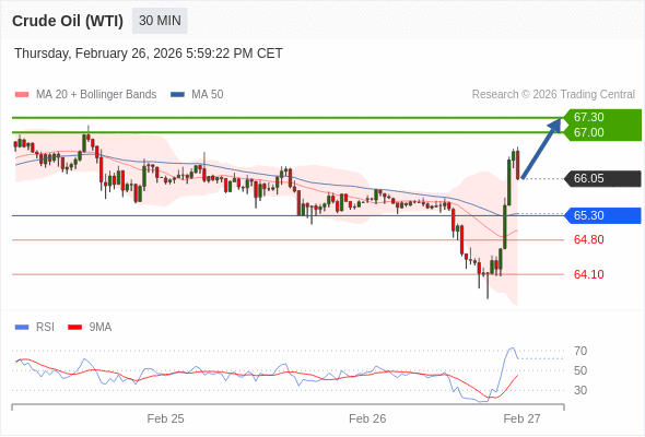 在 65.30 之上,看涨,目标价位为 67.00 ,然后为 67.30 。