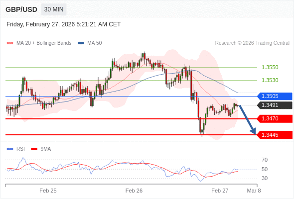 在 1.3505 之下,看跌,目标价位为 1.3470 ,然后为 1.3445 。