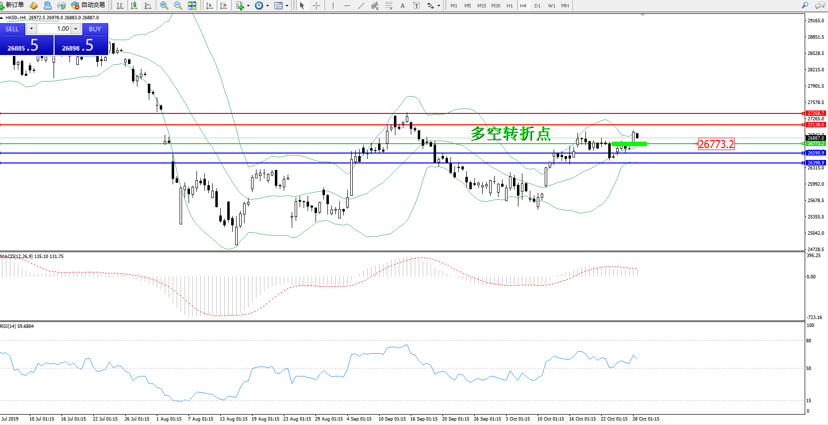 交易策略:26773上方看涨,目标27138、27358