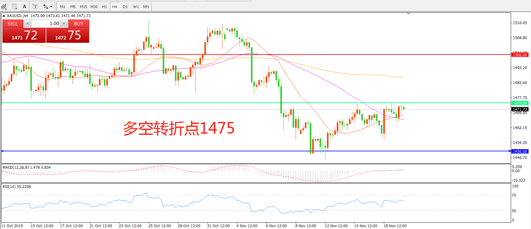 4小时图看,金价延续震荡上行,1475成为短期多空分水岭,均线系统逐渐走平,MACD绿柱减少,RSI指标走平,日内延续震荡概率较大。