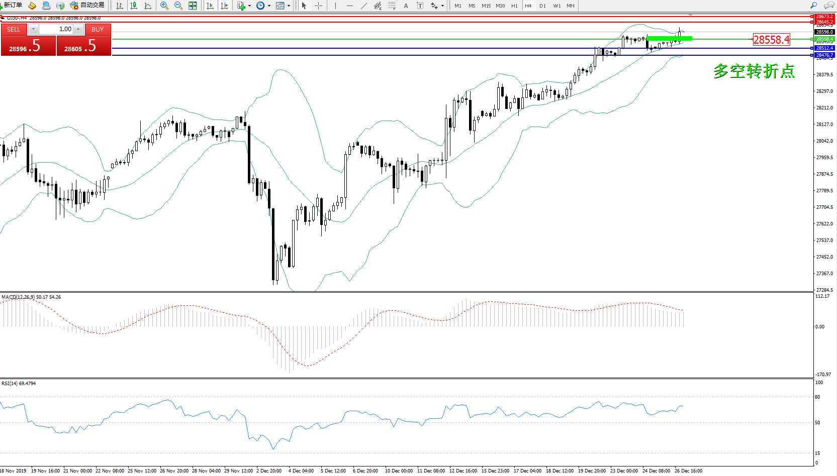 道琼斯指数DJ30—— 4小时K线图显示:
