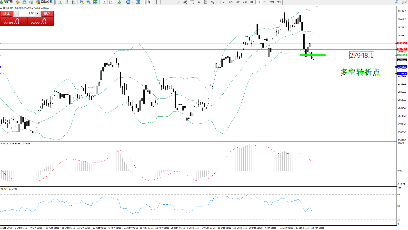 恒指HK50 ——4小时K线图显示: