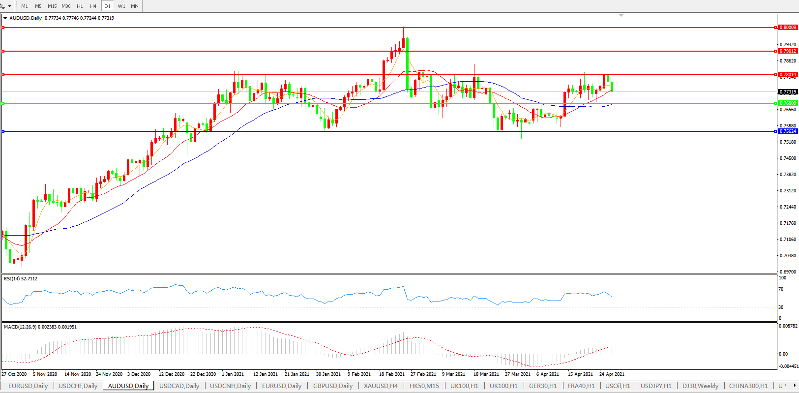 交易策略:0.7680上方看涨,目标0.7800、0.7900