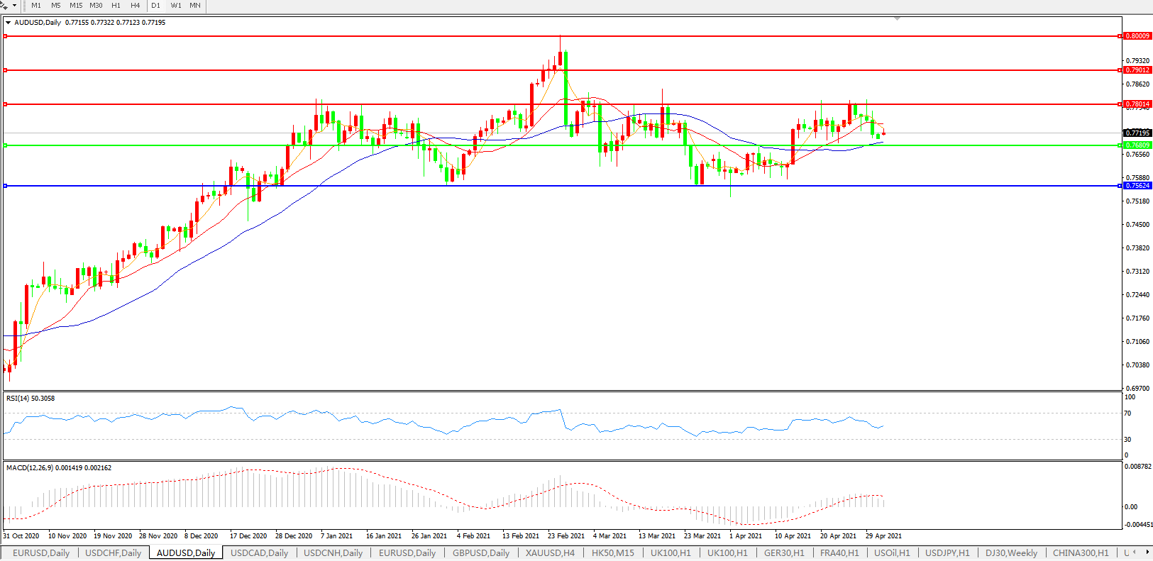 备选策略:0.7680下方看跌,目标0.7560、0.7400