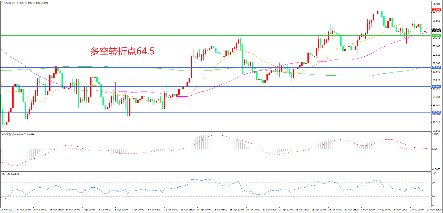 4小时图看,油价回踩55周均线后再次拉升,区间震荡迹象较为明显,66.5美元成为上方阻力,55周期均线成为下方支撑,MACD红柱缩短,RSI指标走平,日内延续震荡概率较大。