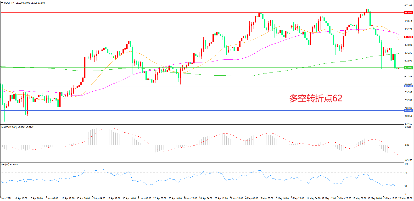 4小时图看,油价连续长阴破位,短期走势相对低迷,200周期均线被跌破,62美元成为多空分水岭,MACD绿柱增加,RSI指标走平,日内延续震荡概率较大。