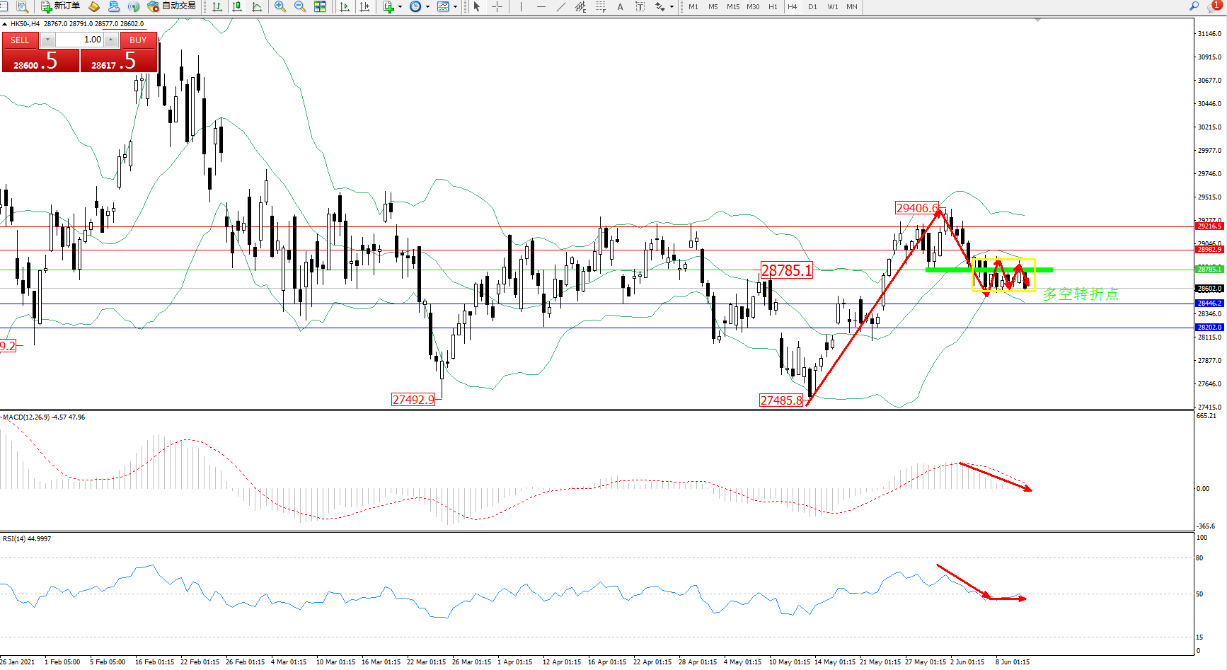 恒指HK50 ——4小时K线图显示: