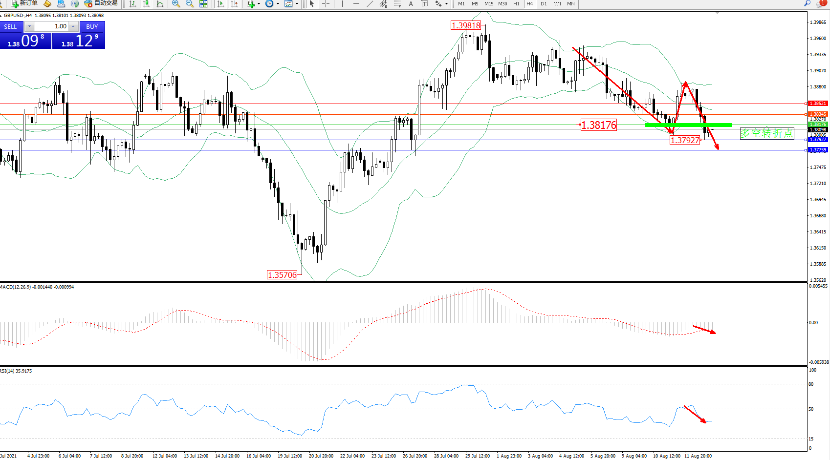 交易策略:1.38176下方看跌,目标1.37927、1.37759