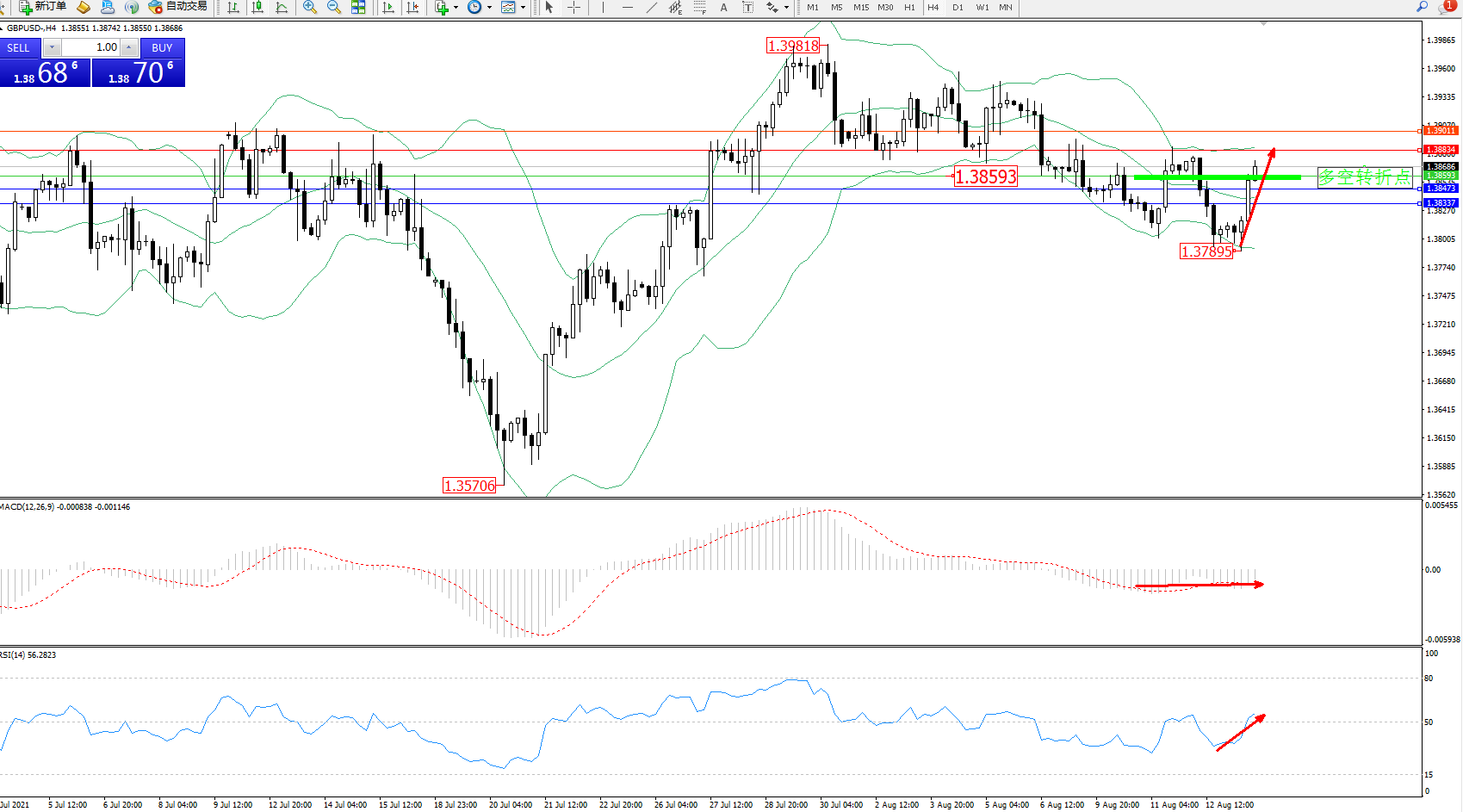 技术点评:空头动力延续布林带指标通道持续震荡下行后,低位抵达1.37895位置得到支撑急速回升,处于中上轨震荡上移,布林带指标呈缓慢张口中,MACD指标处于0轴线下方空头区域窄幅整理,RSI指标纠结于空头区域整理缓慢上移至50均衡线上方移动;