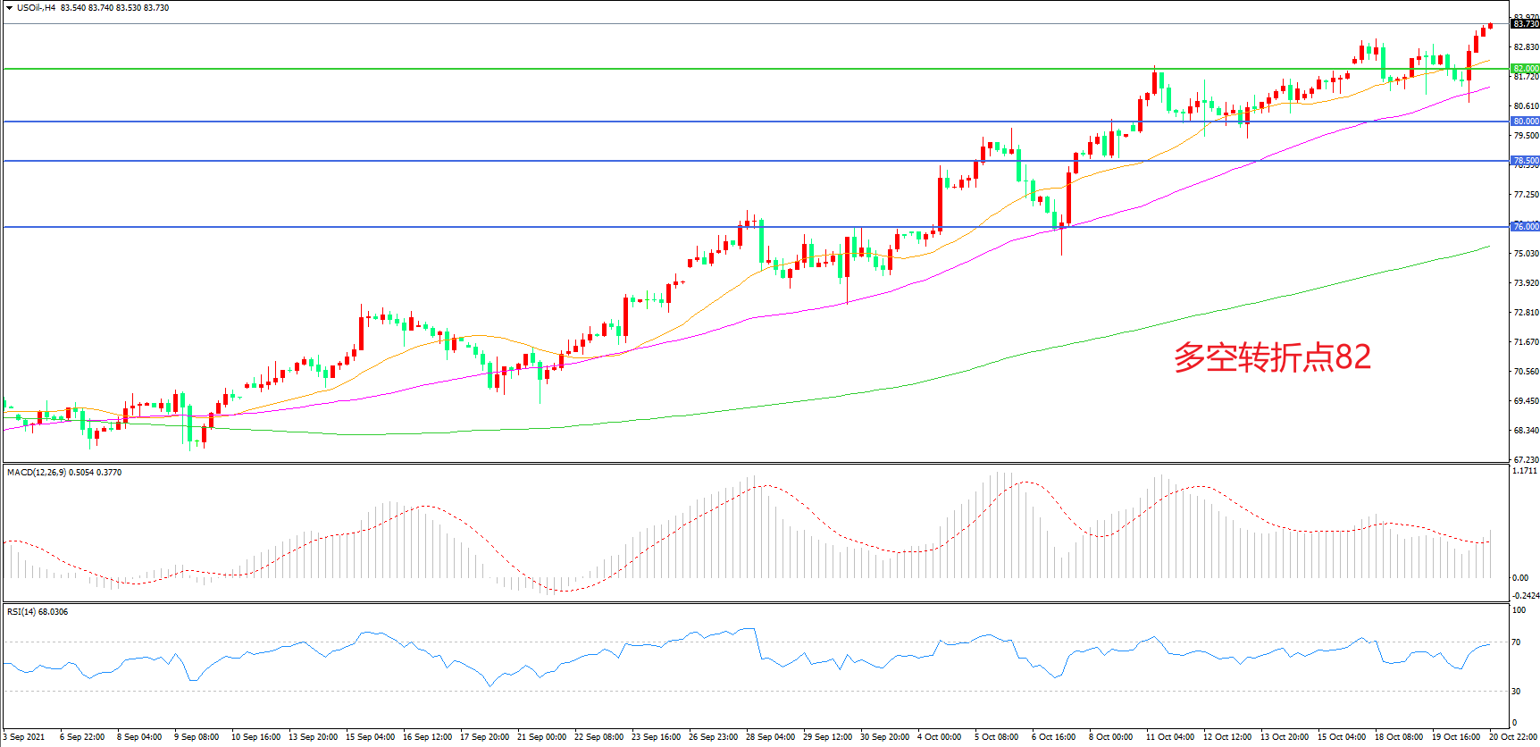 4小时图看,油价以21均线为依托,整体呈现上行形态,MACD红柱增加,RSI指标走平,日内延续上行概率较大。