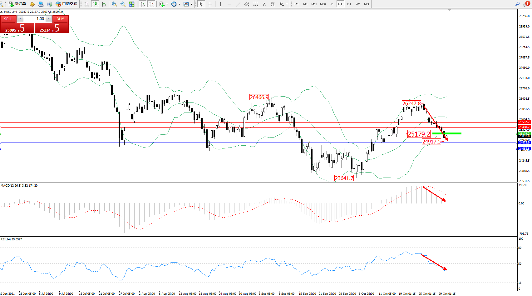 恒指HK50 ——4小时K线图显示: