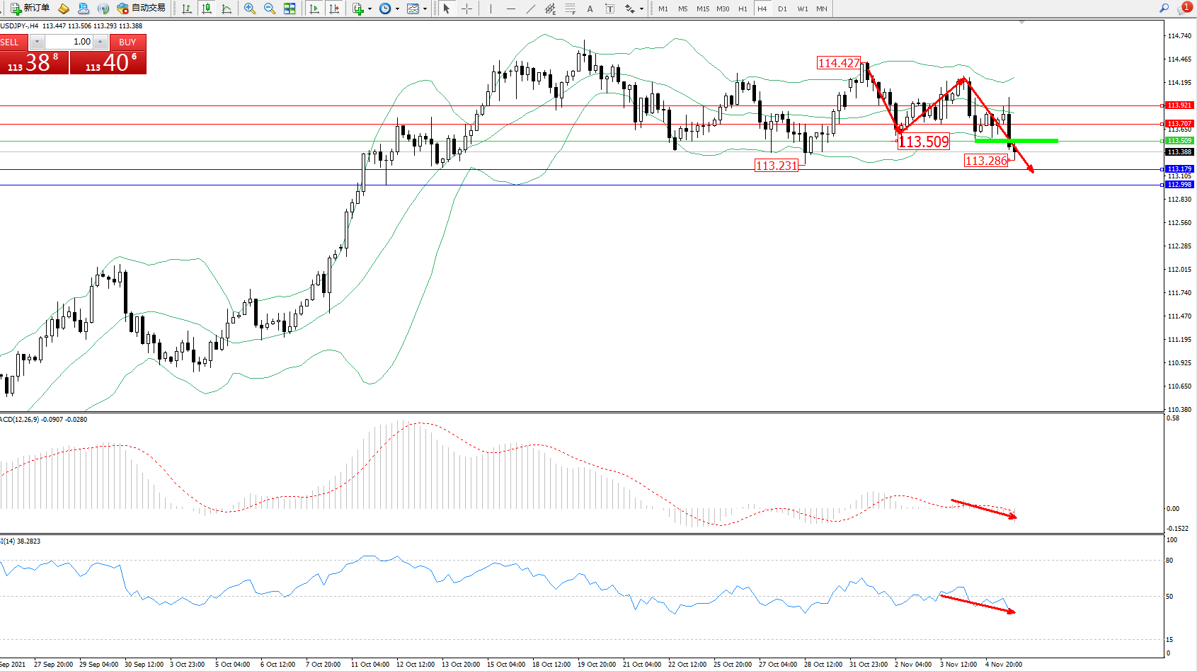 交易策略:113.509下方看跌,目标113.179、112.998