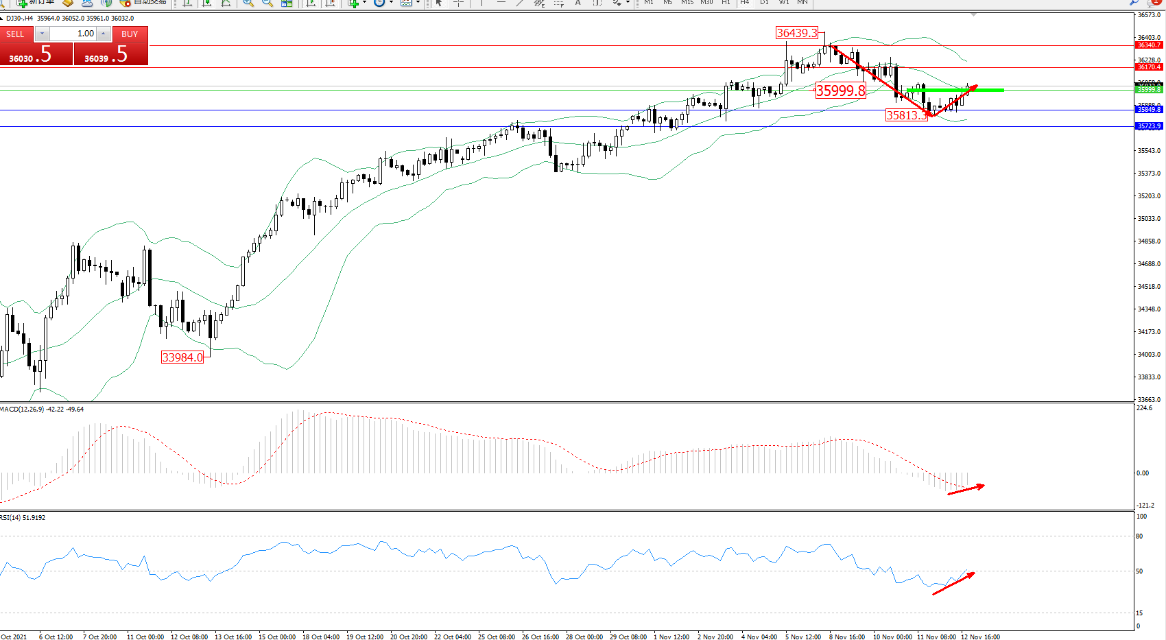 道琼斯指数DJ30——4小时K线图显示: