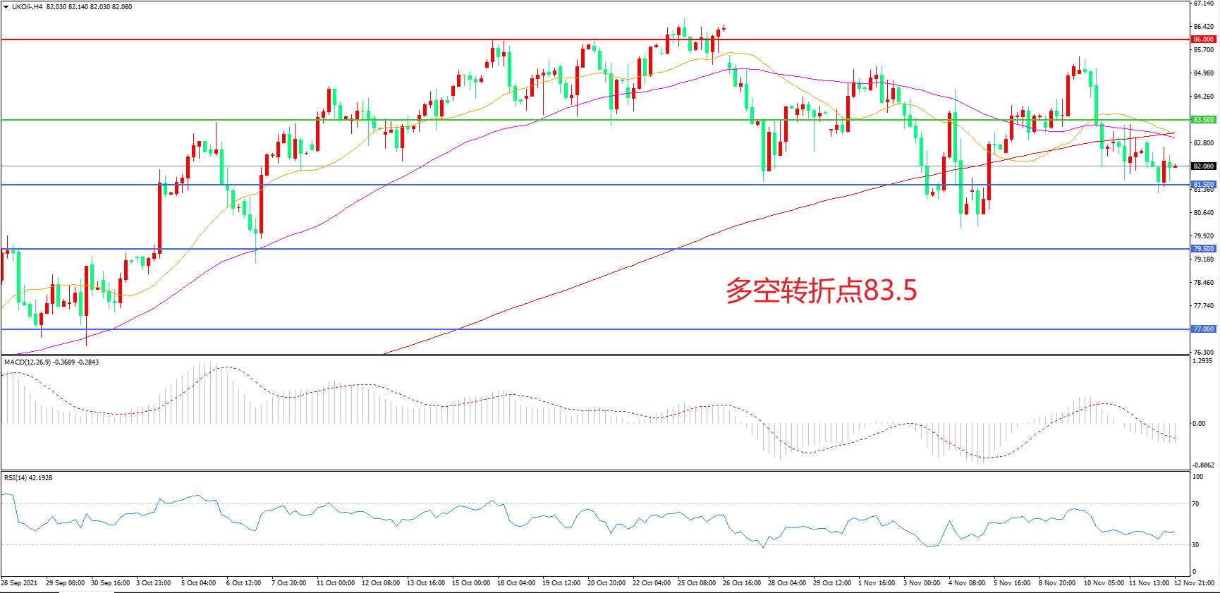 4小时图看,油价破位大跌后于81.5美元附近企稳,但均线逐渐粘合成为阻力,83.5美元成为多空分水岭,MACD绿柱增加,RSI指标走平,日内震荡下行概率较大。