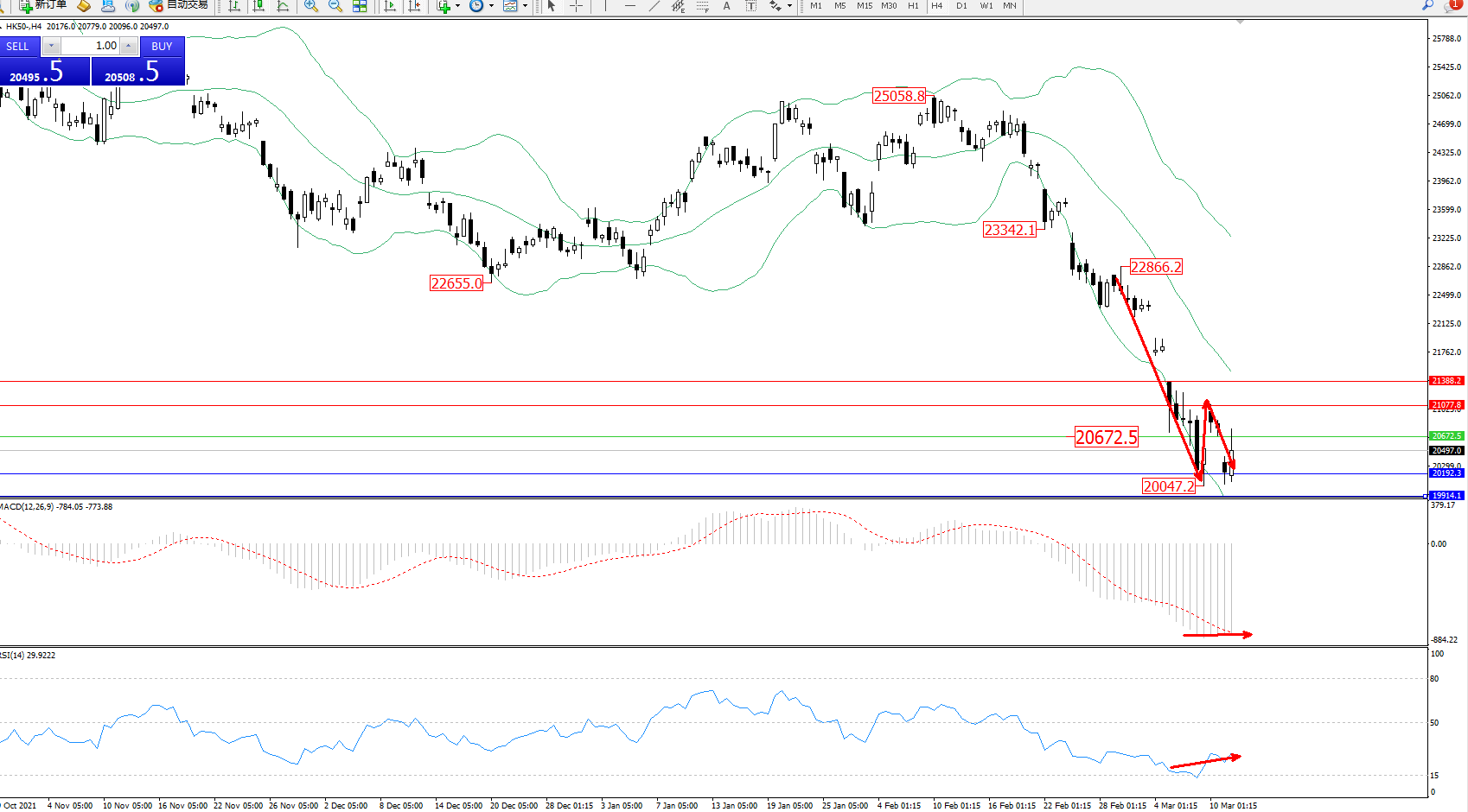 恒指HK50 ——4小时K线图显示: