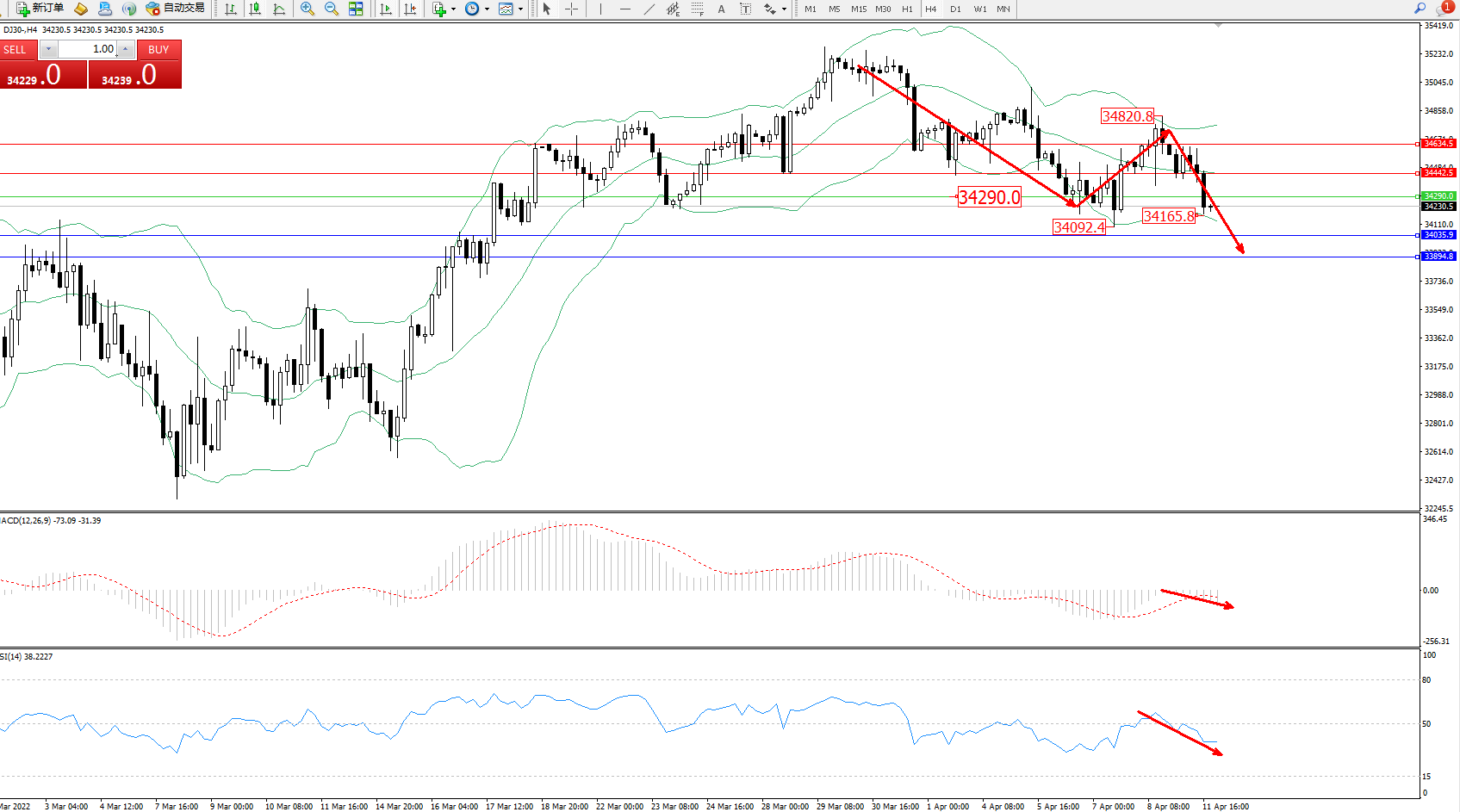 技术点评:空头动力维持在布林带指标通道内呈阶梯式震荡向下移动,低位抵达34165附近节点开始整理,短期空头动力不断向下移动中,布林带指标呈收口走势持续平移,MACD指标处于0轴线下方弱势徘徊中,RSI指标处于50均衡线下侧持续整理;