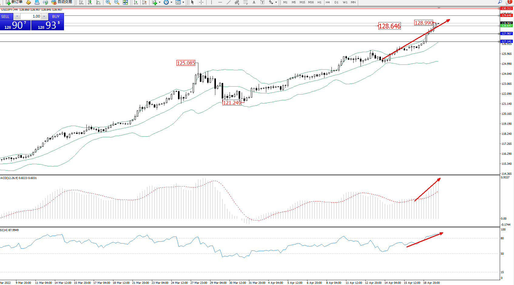 交易策略:128.646上方看涨,目标129.640、130.313