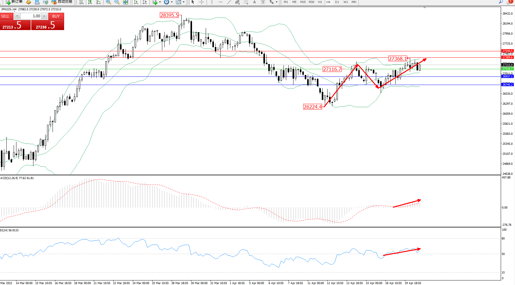 日经指数JPN225——4小时K线图显示:
