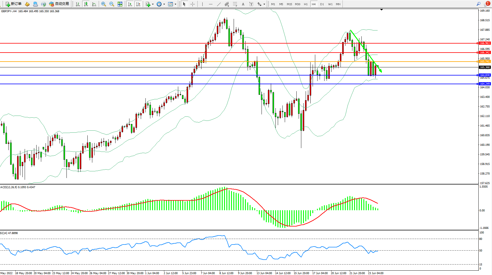4小时图看:高位空头动力维持震荡持续下行,即将触及布林带指标下轨附近节点,布林带指标呈收口走势后平移中,MACD指标处于多头区域维持震荡缓慢下行,RSI指标处于50均衡线附近弱势徘徊;