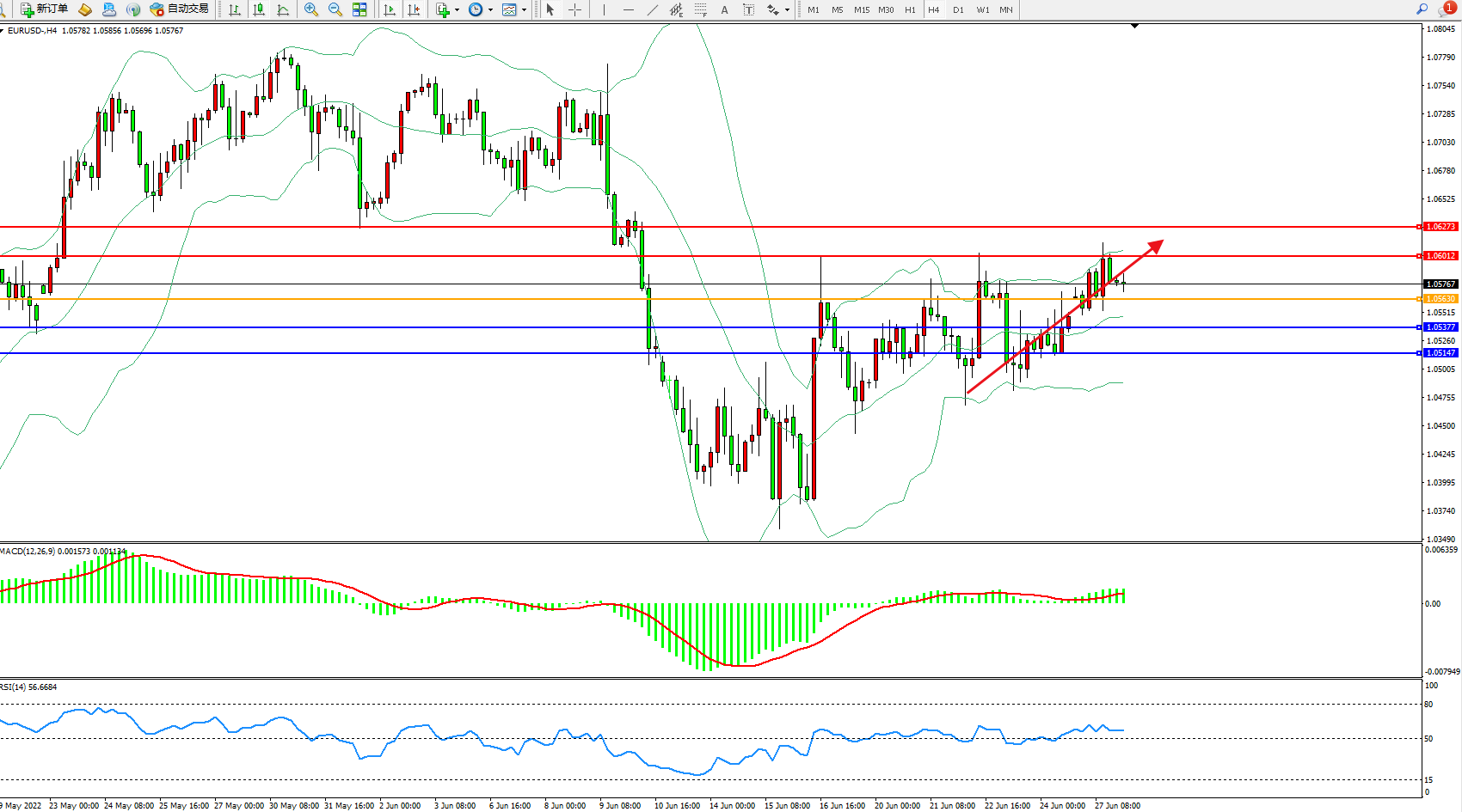 欧元美元EURUSD—4小时K线图显示:
