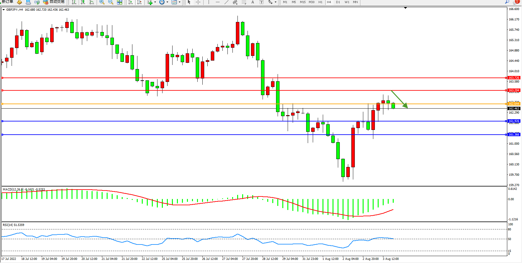 备选策略:162.644上方看涨,目标163.204、163.726