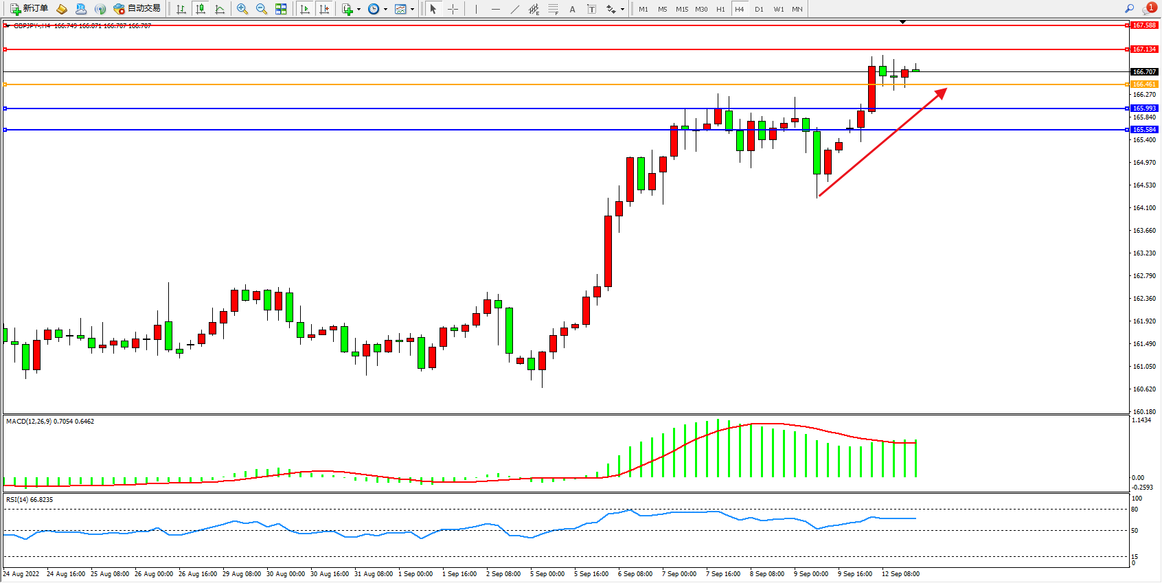 交易策略:166.461上方看涨,目标167.134、164.588