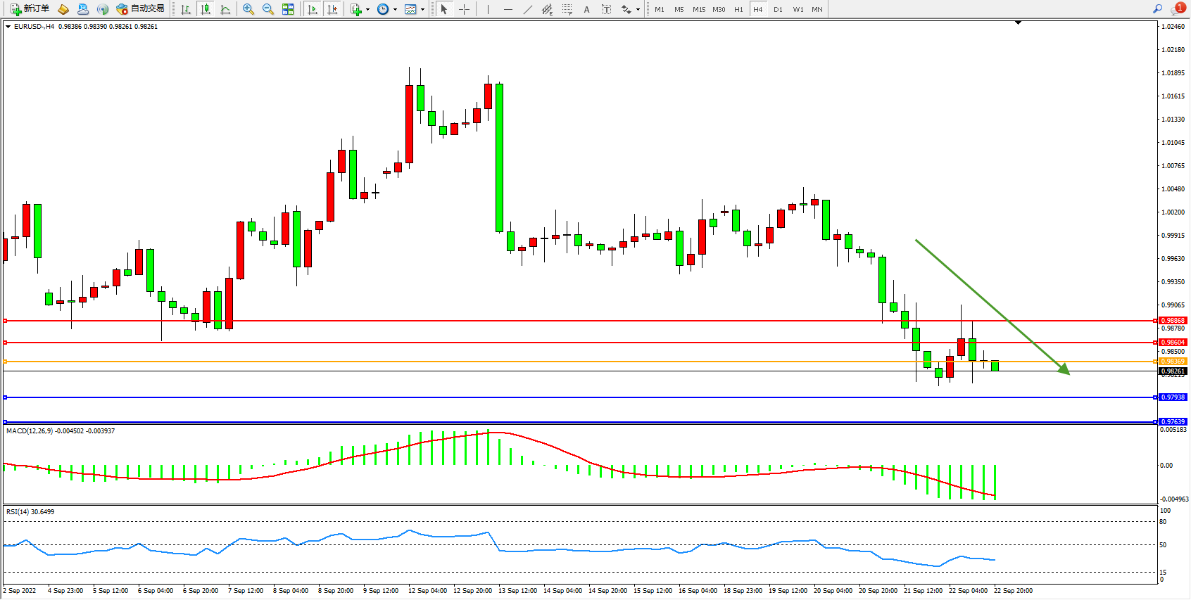 欧元美元EURUSD—4小时K线图显示: