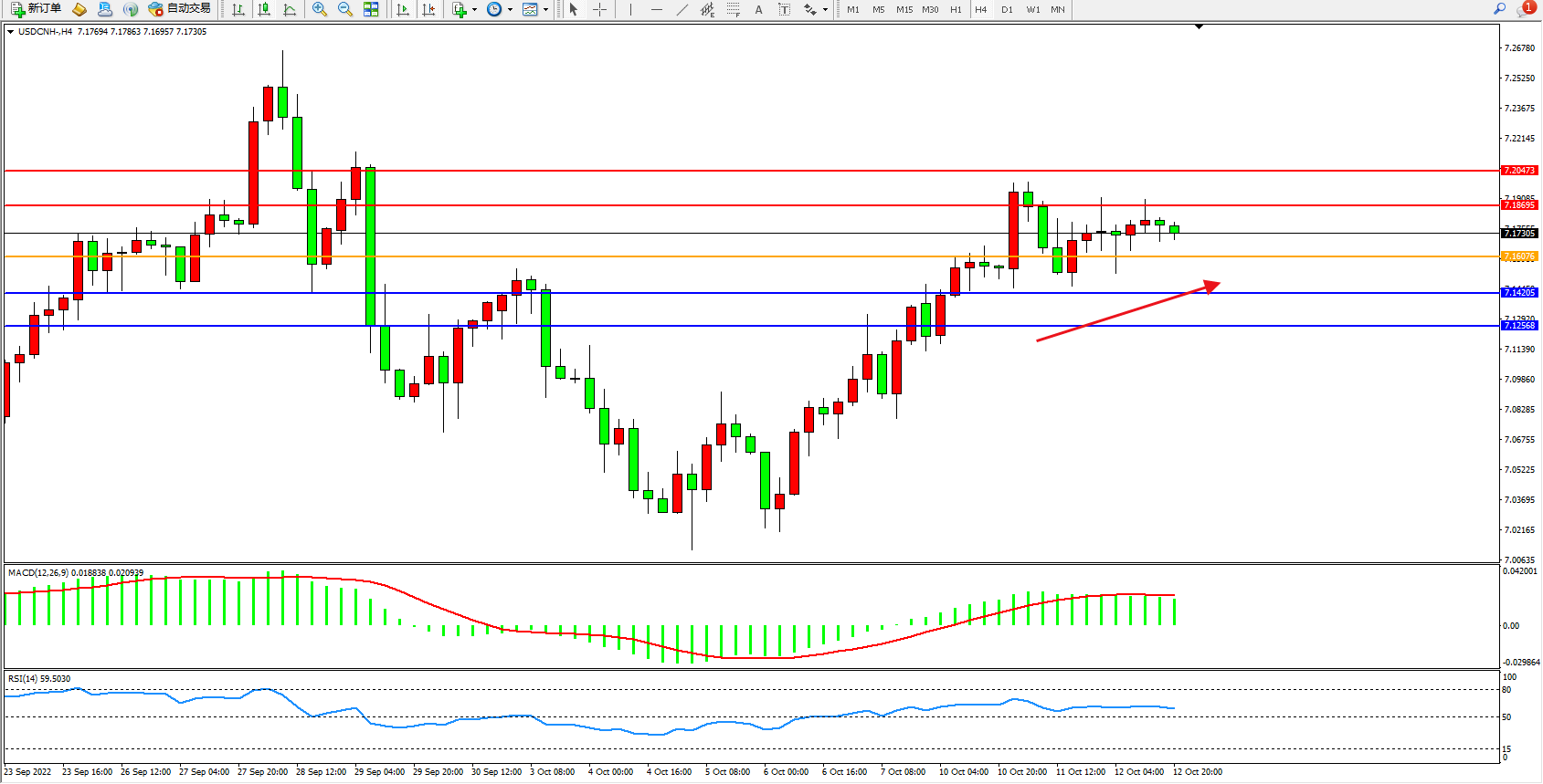 美元人民币USDCNH——4小时K线图显示: