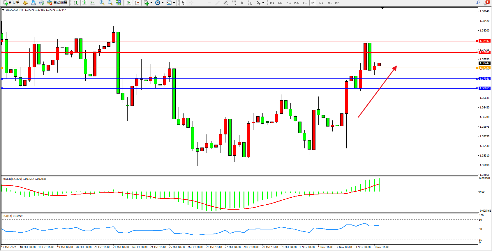 美元加元USDCAD——4小时K线图显示:
