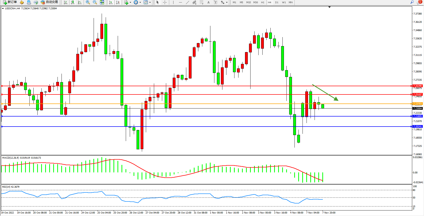 交易策略:7.23703下方看跌,目标7.21805、7.20241