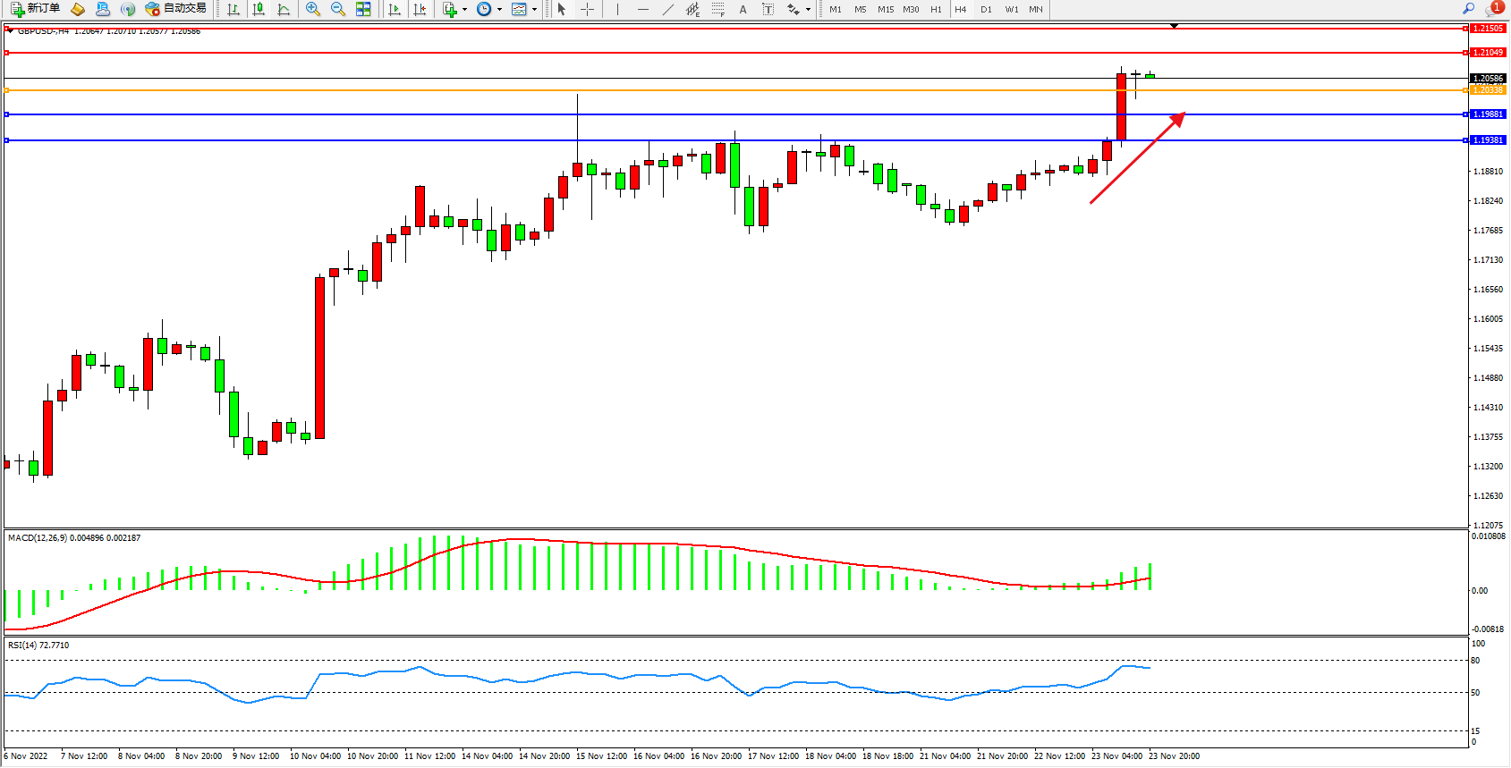 4小时图看:多头动力高位拉升,短期看涨情绪笼罩,市场多头不断攀升,MACD指标处于0轴线上側持续上移,RSI指标处于多头区域高位整理;