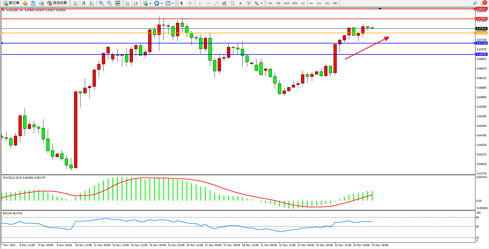 交易策略:0.67508上方看涨,目标0.67885、0.68147