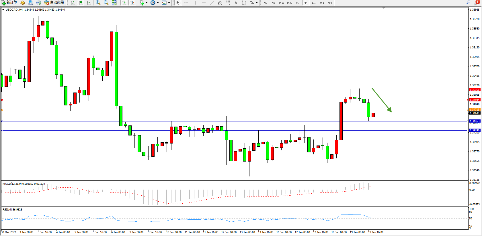美元加元USDCAD——4小时K线图显示: