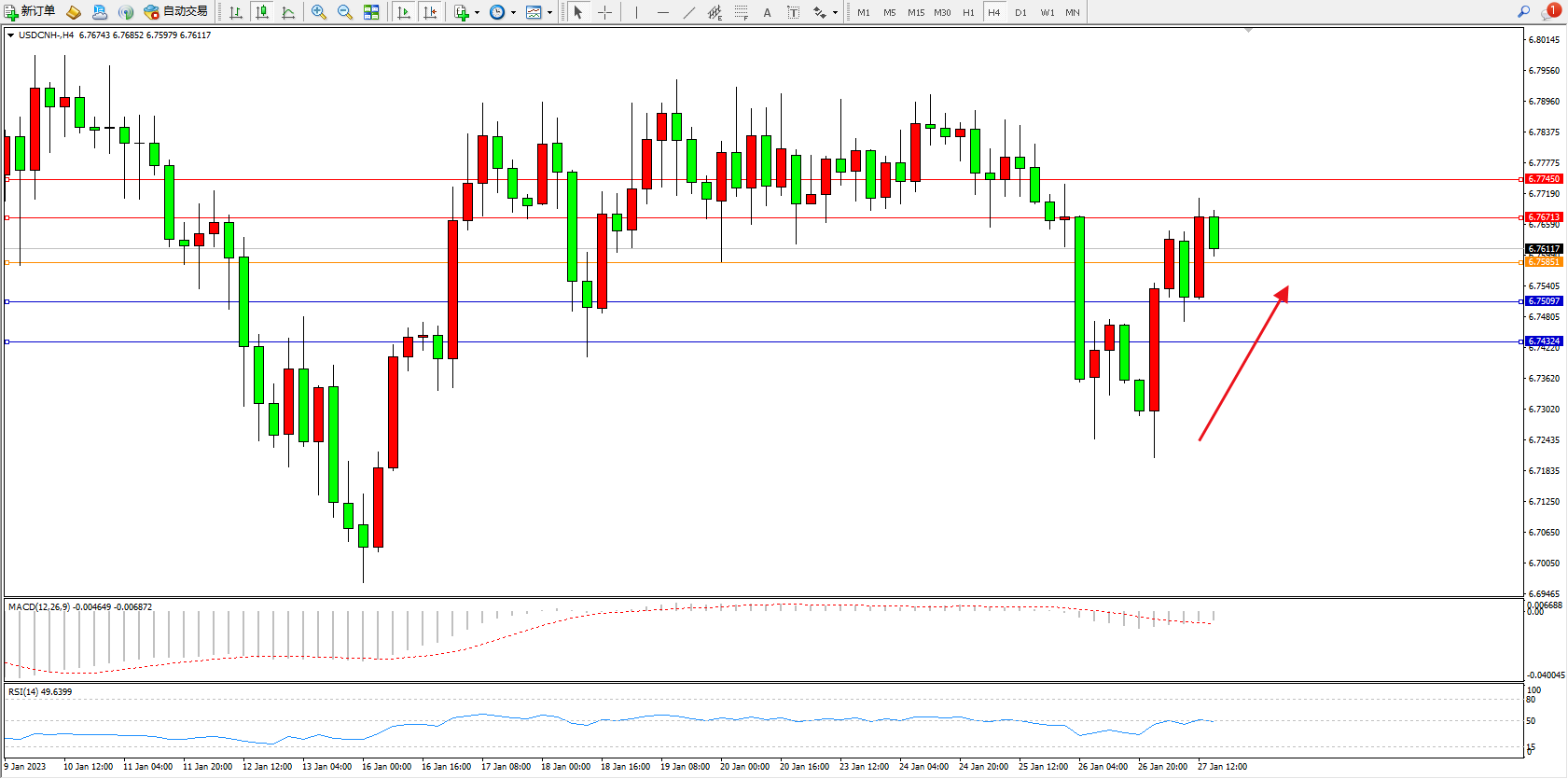 交易策略:6.75851上方看涨,目标6.76713、6.77450