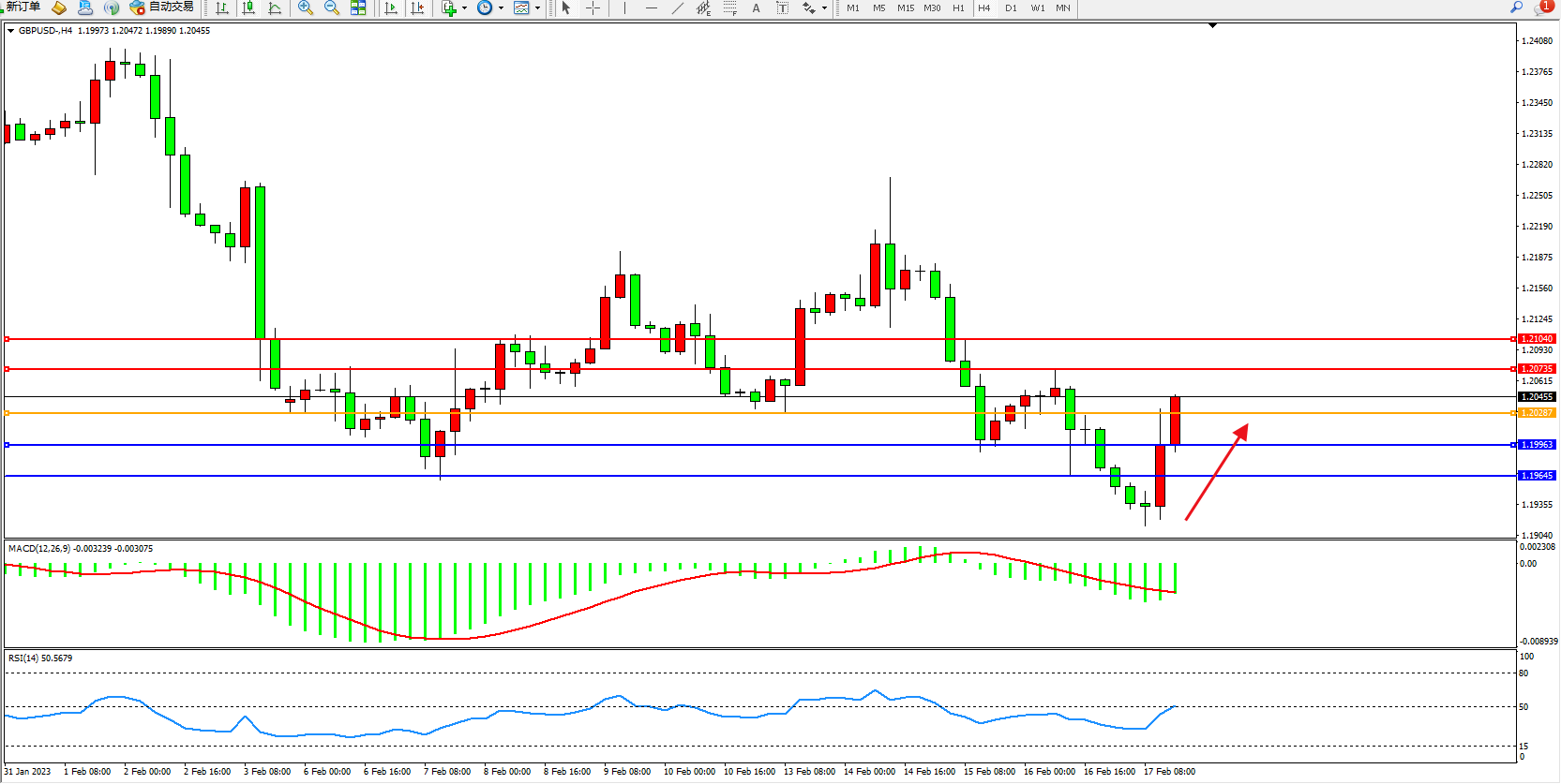 英镑兑美元维持1.20455附近震荡,英国央行已经暗示可能在3月停止加息,而通胀数据强化了这一观点。如此,仅在息差这一项影响因素上,就将英镑摆在了不利的一面。