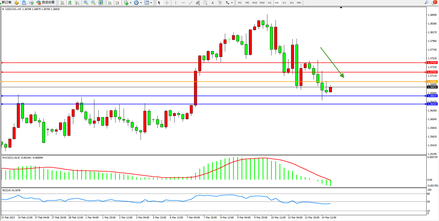 美元加元USDCAD——4小时K线图显示: