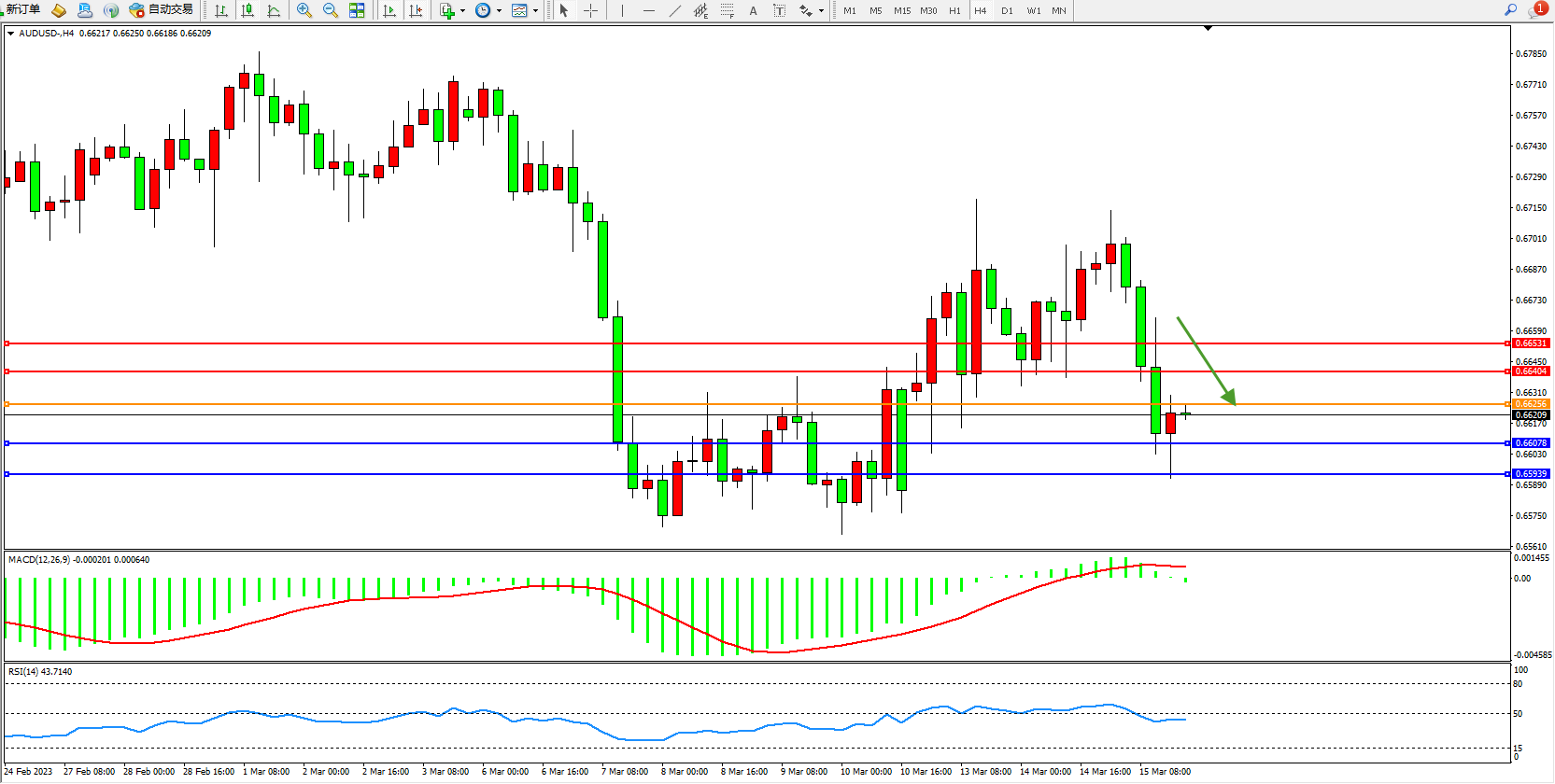 澳元美元AUDUSD——4小时K线图显示: