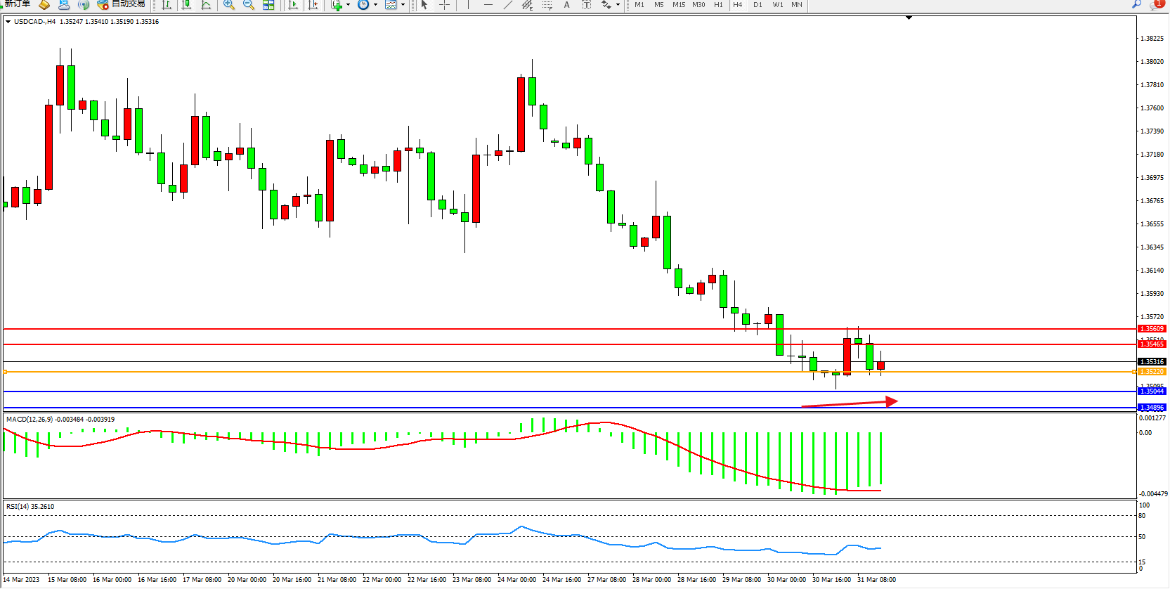 美元加元USDCAD——4小时K线图显示: