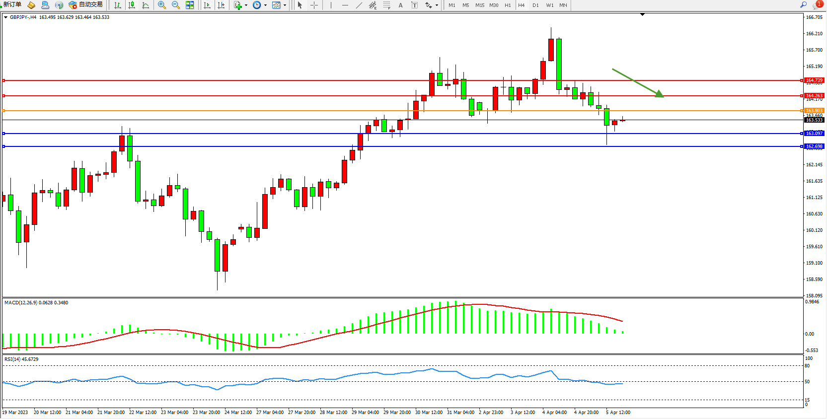 交易策略:163.803下方看跌,目标163.097  162.698