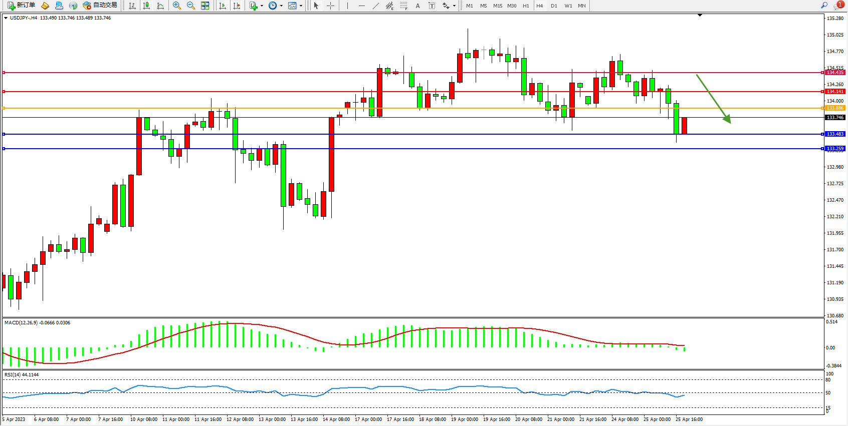 交易策略:133.886下方看跌,目标133.483 133.259