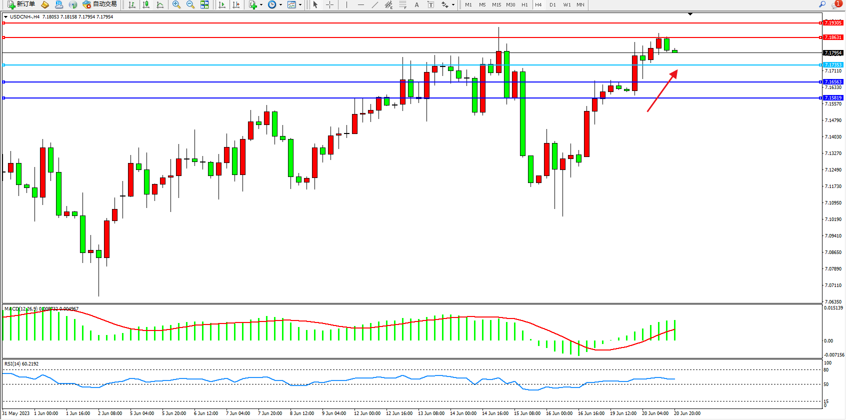 美元人民币USDCNH——4小时K线图显示: